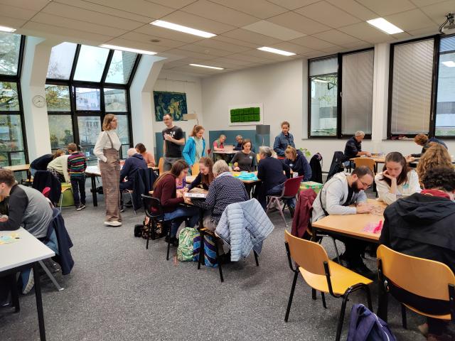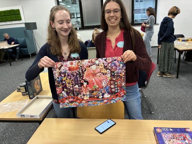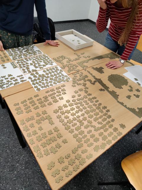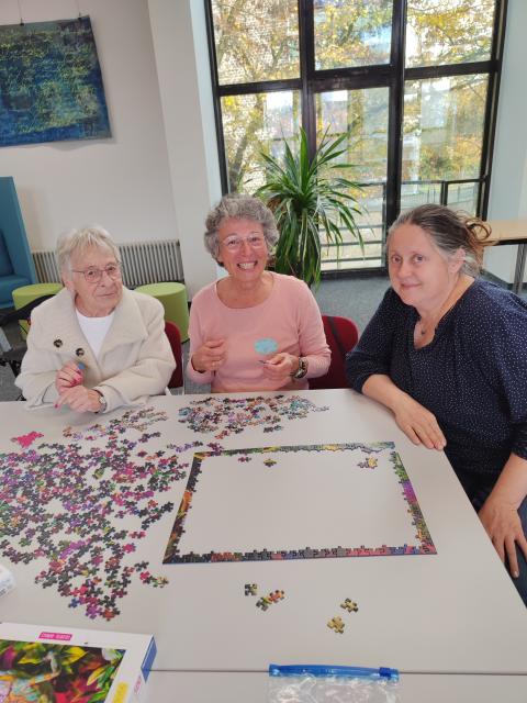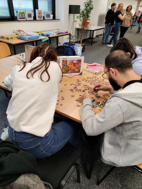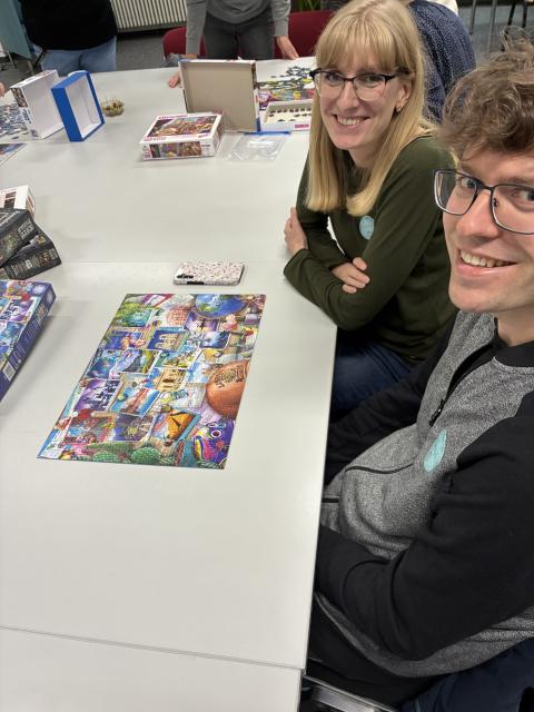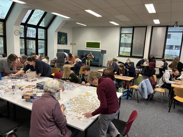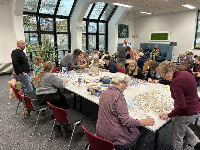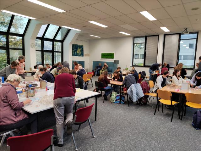 Die Runde war bunt durchmischt, Jung und Alt fanden sich zusammen. Zeitweise puzzelten 30 Puzzlebegeisterte gleichzeitig in der Lernwerkstatt der Stadtbibliothek Aachen, sodass noch weitere Tische benötigt wurden.