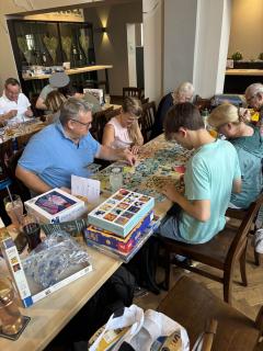 An diesem Nachmittag freuten wir uns, sowohl gute Freunde wieder zu sehen, als auch neue Teilnehmerinnen und Teilnehmer begrüßen zu können. So erhielten wir Besuch von vier Gästen, welche – wie es bei uns so üblich ist – gleich in die Puzzlegruppen integriert wurden. Solche Besuche sind uns ja immer willkommen und wir freuen uns über jeden, der unser Hobby teilt.